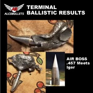We at Alco appreciate Robert’s kind words. Serious outdoorsmen will appreciate the Air Boss .457 excellent air rifle bullets designed for extreme accuracy and maximum terminal ballistics. Upon impact, the metal tip separates allowing the lead pellet to become an open hollow point allowing for significant expansion to take down game humanely. Alco big bore airgun ammo is composed of a swaged soft 100% lead for additional measures to increase your ballistic results. All of Alco’s big bore air gun pellets are engineered for targets and North American big game hunting. Working in conjunction with prominent airgun manufacturers, we developed the most accurate airgun pellets for serious hunters and shooters in the marketplace. Customers come back due to the “dead-on” accuracy. This great airgun pellet is designed big bore .457 air rifles, such as the 45 Caliber AirForce Texan.